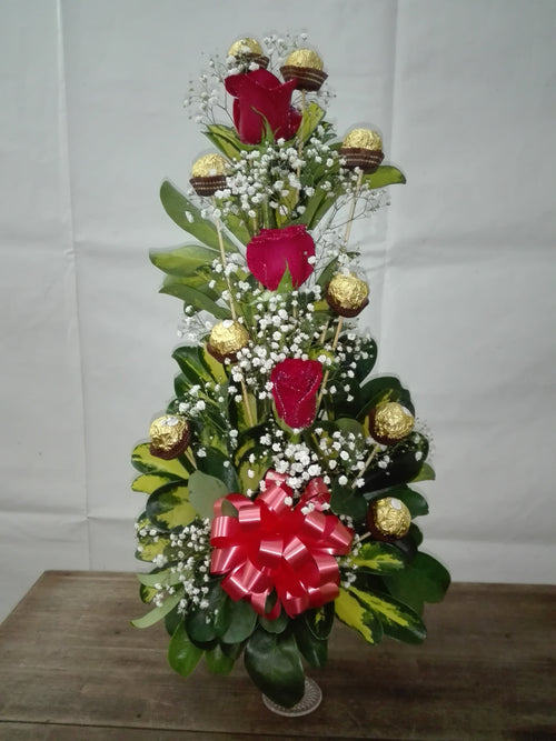 Arreglo Floral con Rosas y Bombones